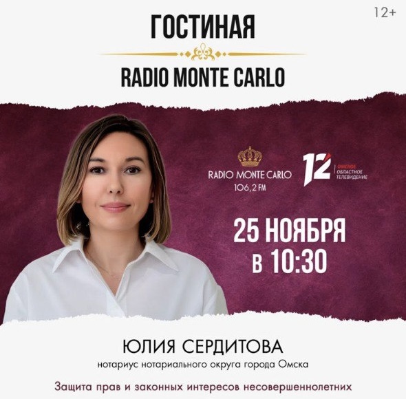 25 ноября прямого эфира на радио Монте Карло и на 12 городском канале стала нотариус города Омска Юлия Сердитова. Она рассказала о том, как нотариусы защищают права и законные интересы детей.