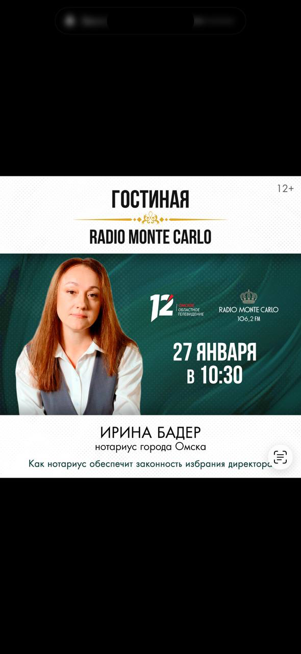 27 января нотариус города Омска Ирина Бадер стала гостем прямого эфира на радио Монте Карло. Тема эфира - «Как нотариус обеспечит законность избрания директора».