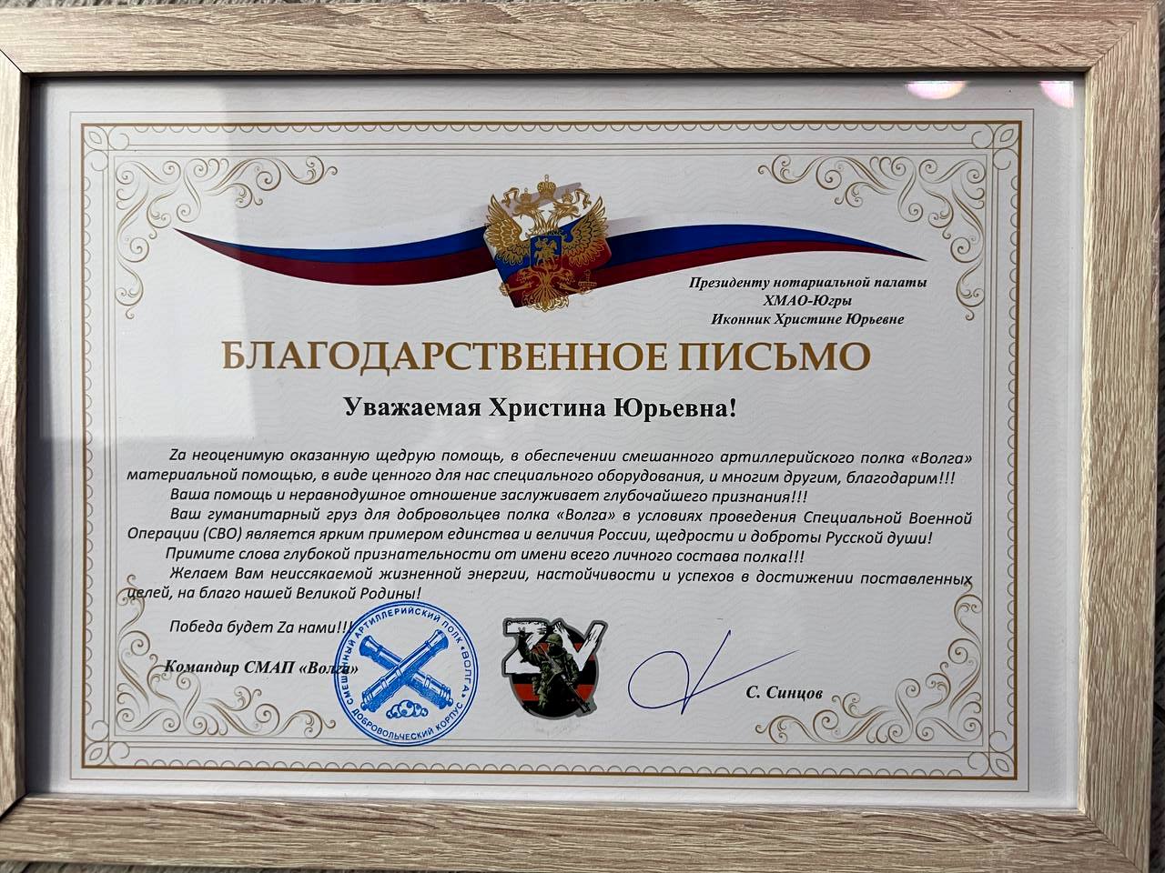 «Примите слова глубокой признательности от имени всего личного состава полка! За неоценимую оказанную щедрую помощь в обеспечении СМАП «Волга» материальной помощью в виде ценного для нас спецоборудования и многим другим благодарим», - говорится в благодарности командира СМАП «Волга», адресованной президенту палаты Христине Иконник.