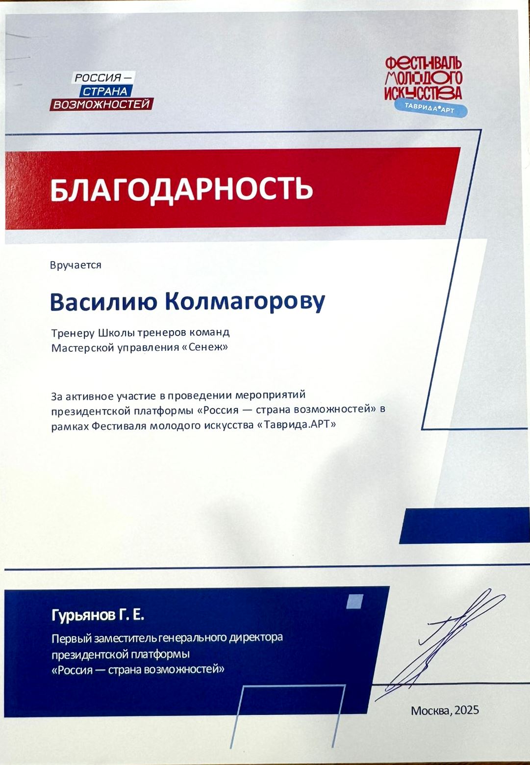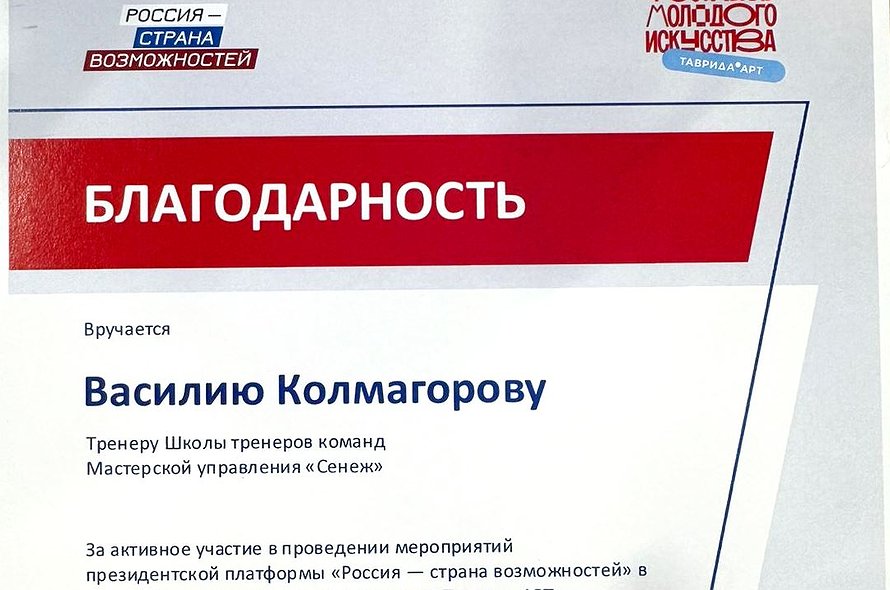 Представитель нотариата Ханты-Мансийского автономного округа-Югры получил награду за активное участие в качестве тренера школы тренеров команд Мастерской управления «Сенеж» при проведении мероприятий президентской платформы «Россия – страна возможностей» в рамках Фестиваля молодого искусства «Таврида.АРТ».