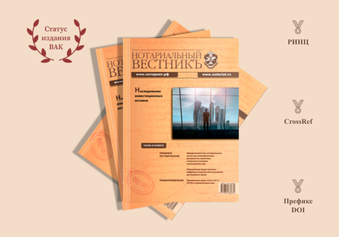 Журнал «Нотариальный вестник» успешно прошел многоэтапную экспертизу, включающую оценку Российской академии наук, и подтвердил соответствие строгим критериям. В частности, учитывались: научное цитирование в изданиях «Белого списка»; публикация рецензируемых научных материалов; соответствие этическим стандартам публикаций; профессиональная репутация главного редактора и редколлегии; наличие сайта с машиночитаемыми метаданными публикаций; присвоение цифровых идентификаторов DOI и др.