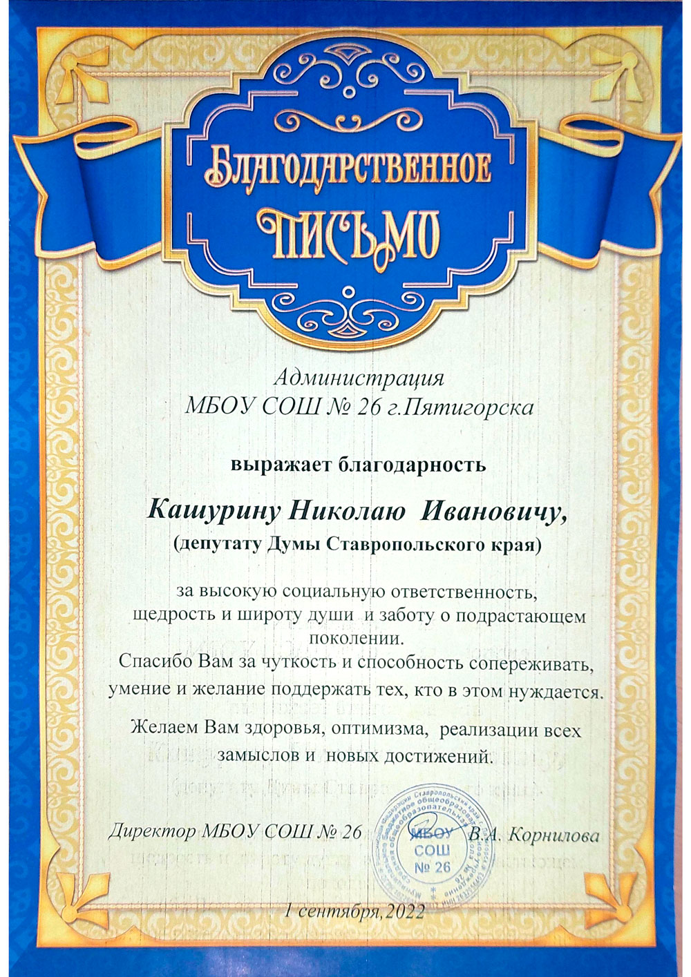 «С большим волнением вспоминаю свои школьные годы. Этот незабываемый, значимый и дорогой период детства и юности прошел на моей малой родине, в любимом Пятигорске, в стенах школы № 26, – отметил в поздравлении Николай Кашурин. – Отрадно на протяжении многих десятилетий чувствовать ту связующую нить, которая неразрывно соединяла меня и родную школу. С течением лет эта связь стала еще крепче, а те знания, умения, навыки, жизненные уроки, которые я получил в ней, неоднократно подтвердили свою неоспоримую важность и ценность.