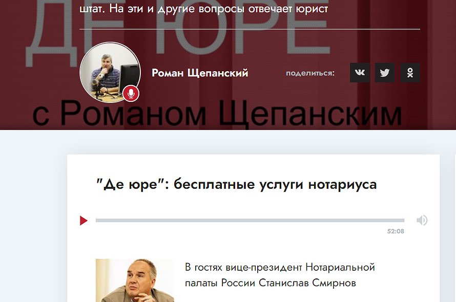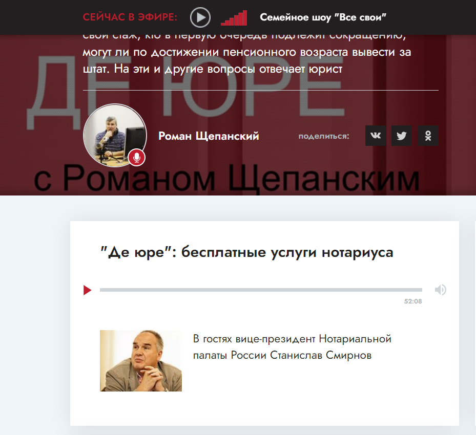 15 июля вице-президент Федеральной нотариальной палаты, президент Московской областной Нотариальной Палаты Станислав Смирнов стал гостем программы «Де юре» в студии «Радио Москвы».