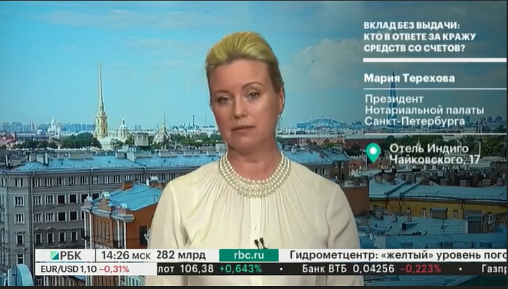 11 сентября 2019 года президент Нотариальной палаты Санкт-Петербурга Мария Терехова приняла участие в программе "Деловой день" телеканала РБК. Тема программы – "Вклад без выдачи: кто в ответе за кражу средств со счетов?". Комментарии по теме дали представители одного из коммерческих банков г. Москвы, а также Арбитражного третейского суда. На вопрос ведущего программы "Как сотрудник банка может проверить подлинность доверенности?" ответила Мария Викторовна. Всю программу можно посмотреть по ссылке: http://tv.rbc.ru/archive/den/5d78df712ae5963e7dcb5dd5