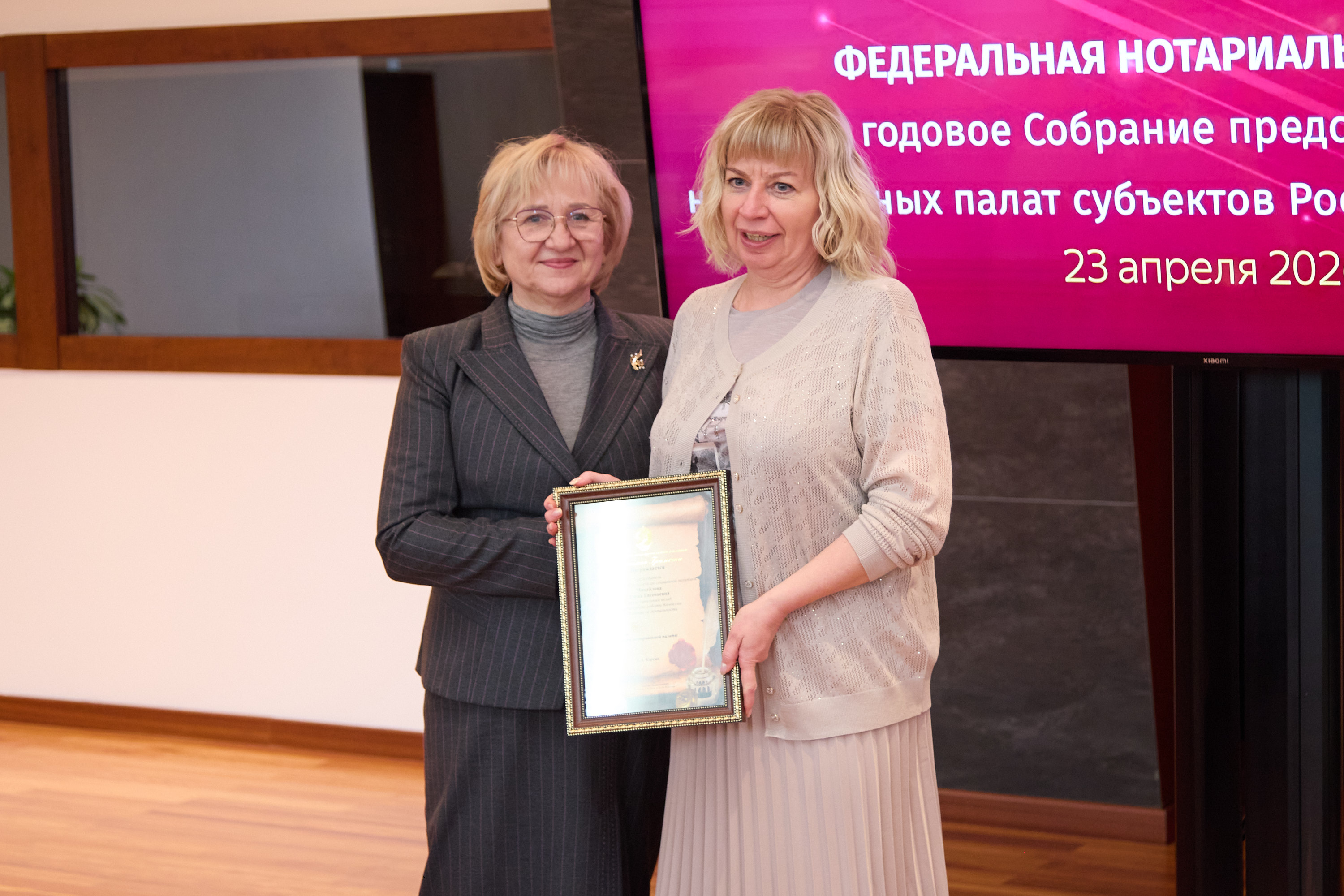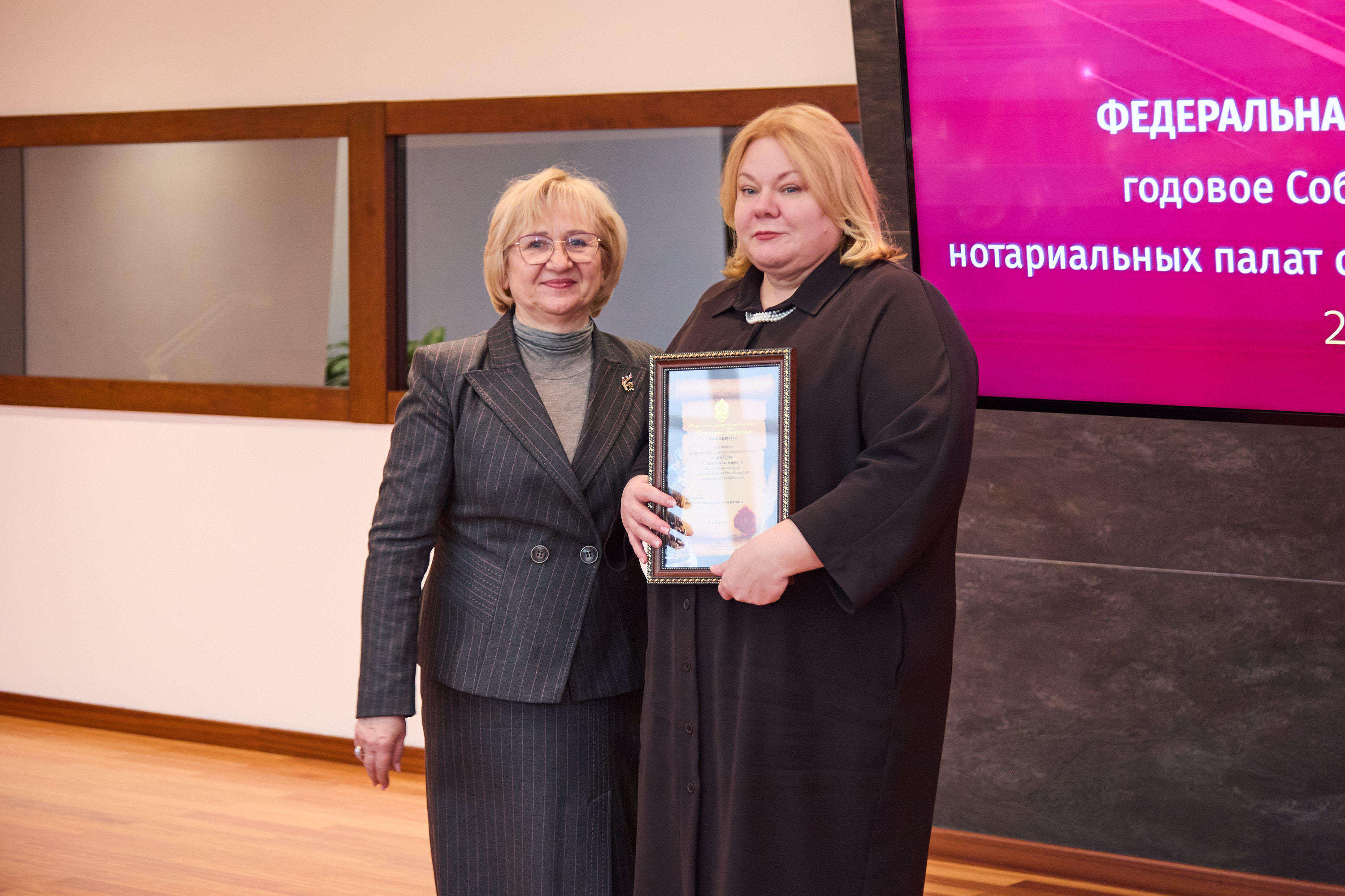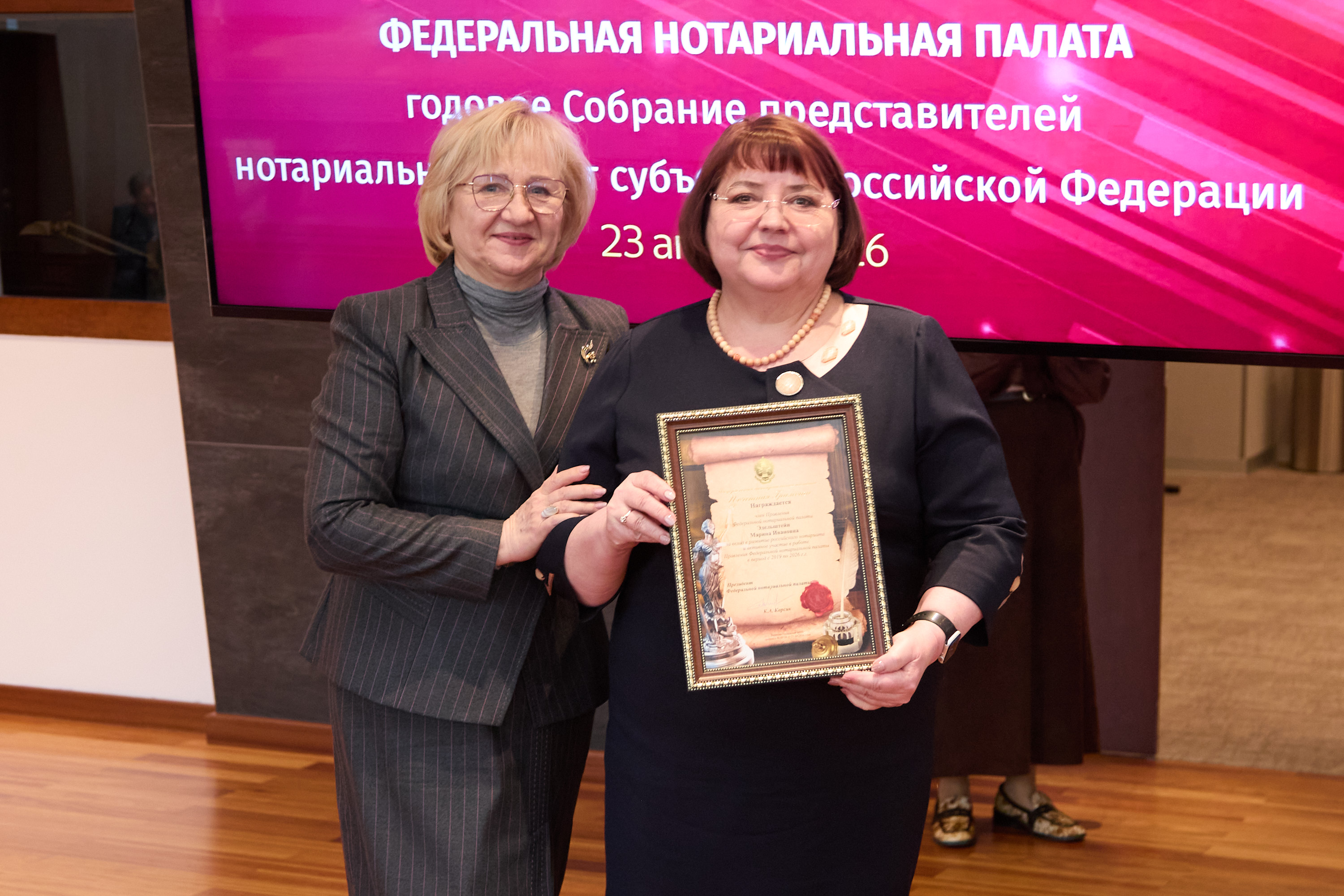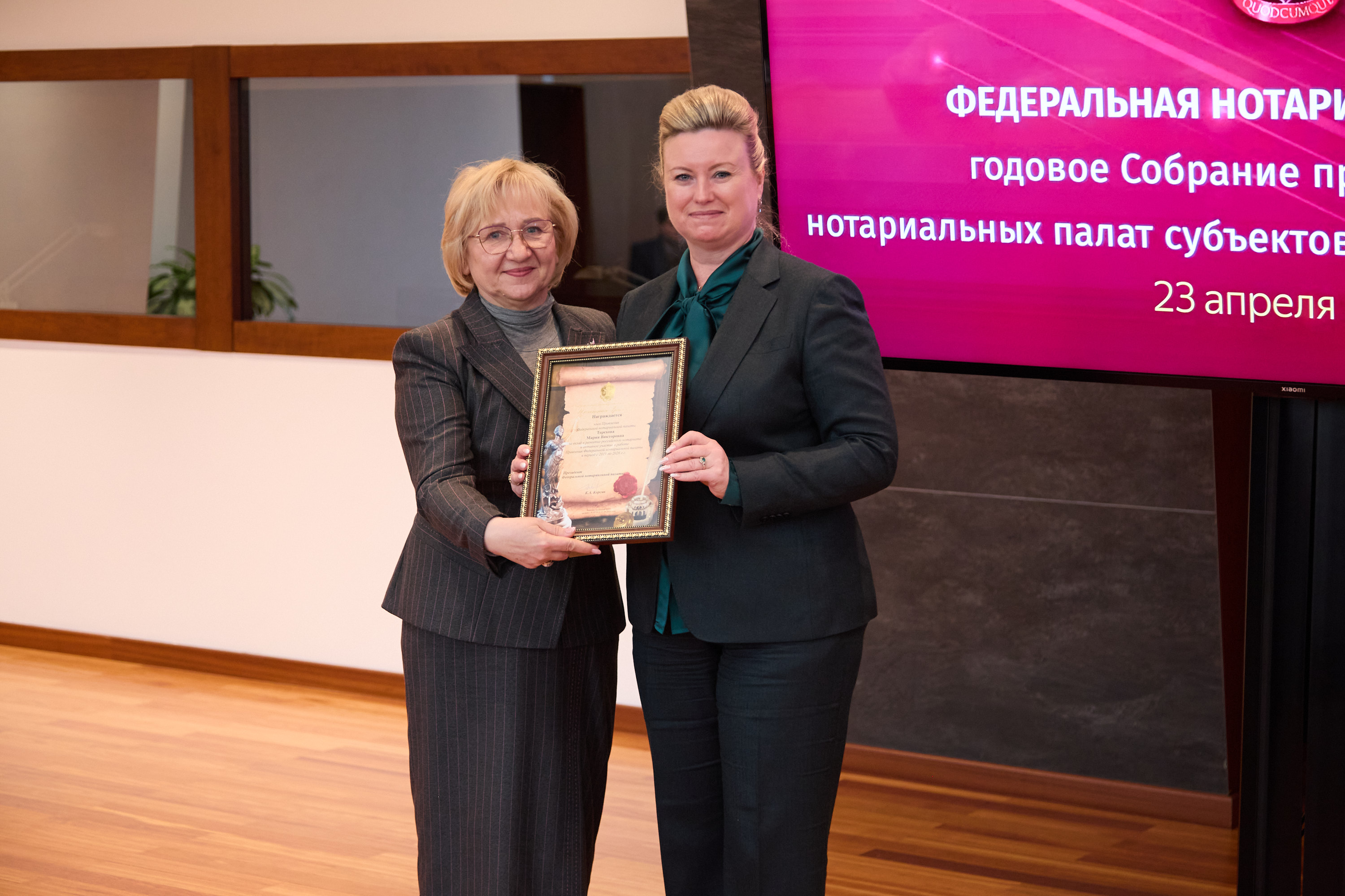 Медалью Юрия Иутина «За безупречное служение и верность профессии» были награждены президент Приморской краевой нотариальной палаты Наталья Егорова, президент Брянской областной нотариальной палаты Валентина Савельева.