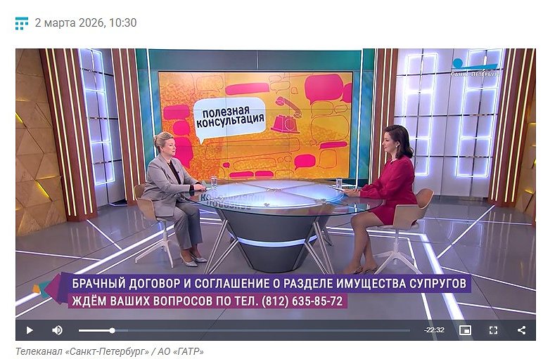 Вице-президент Нотариальной палаты Северной столицы Мария Терехова стала гостьей студии телеканала «Санкт-Петербург». В прямом эфире «Полезной консультации» она обсудила особенности брачного договора и соглашения о разделе имущества.