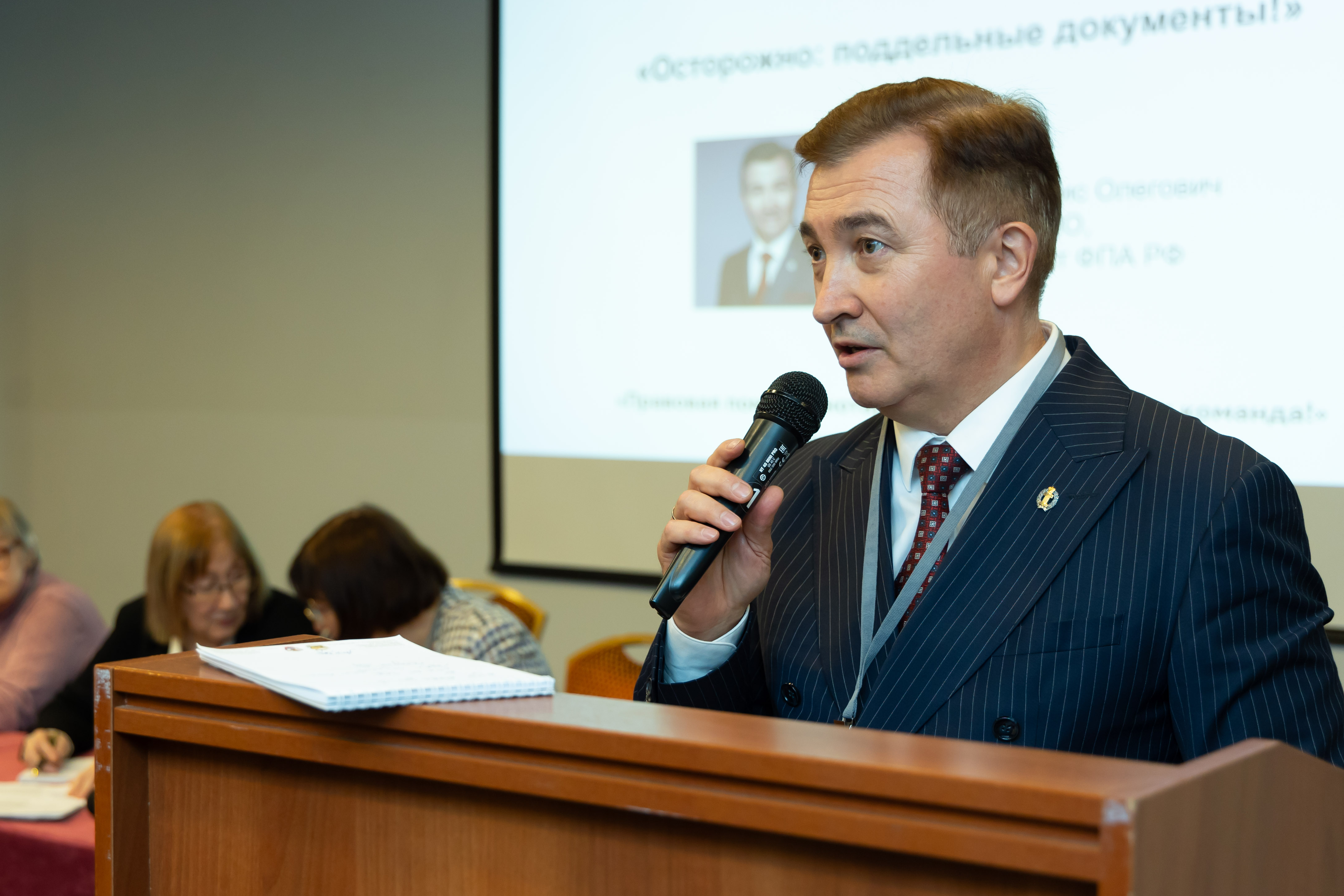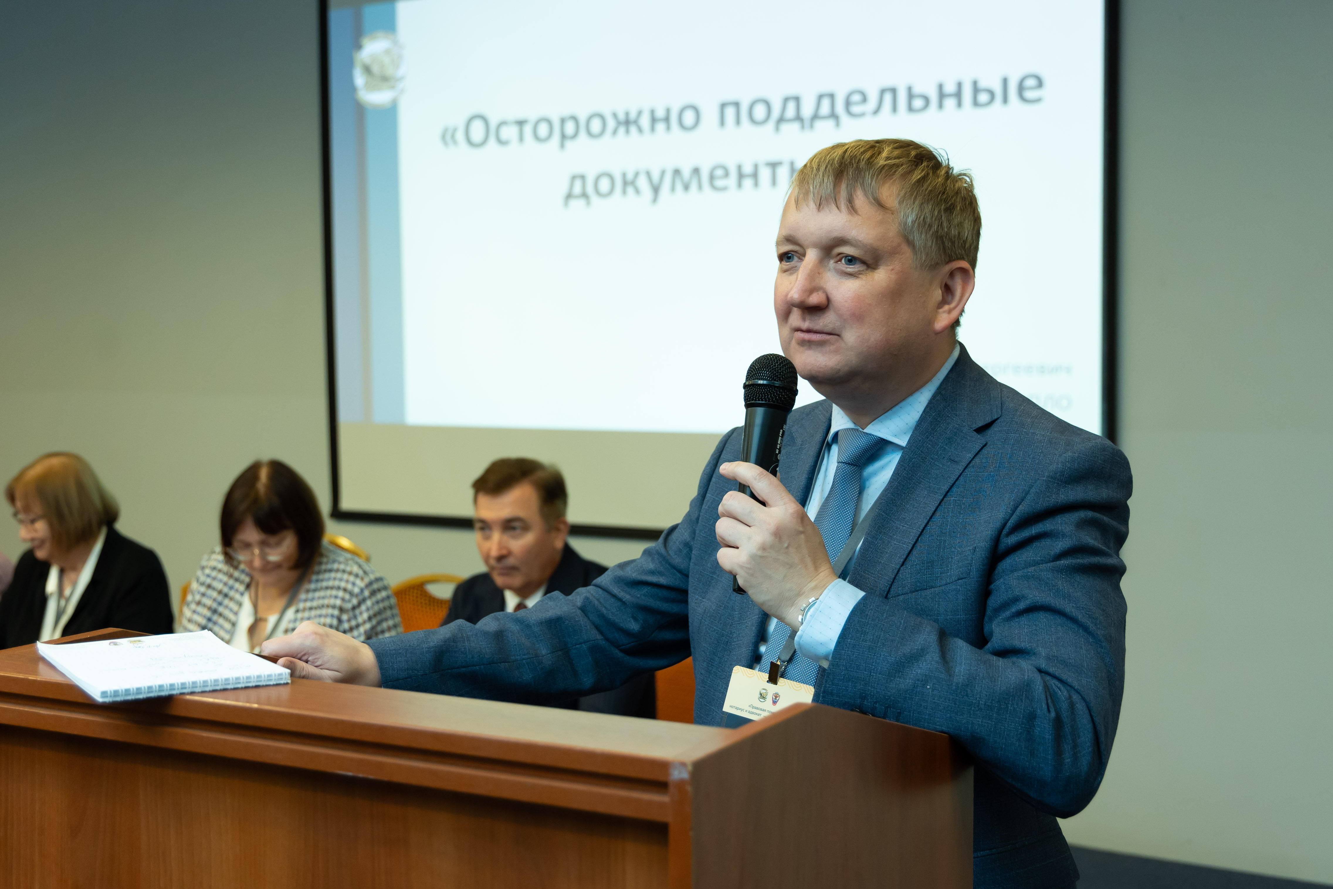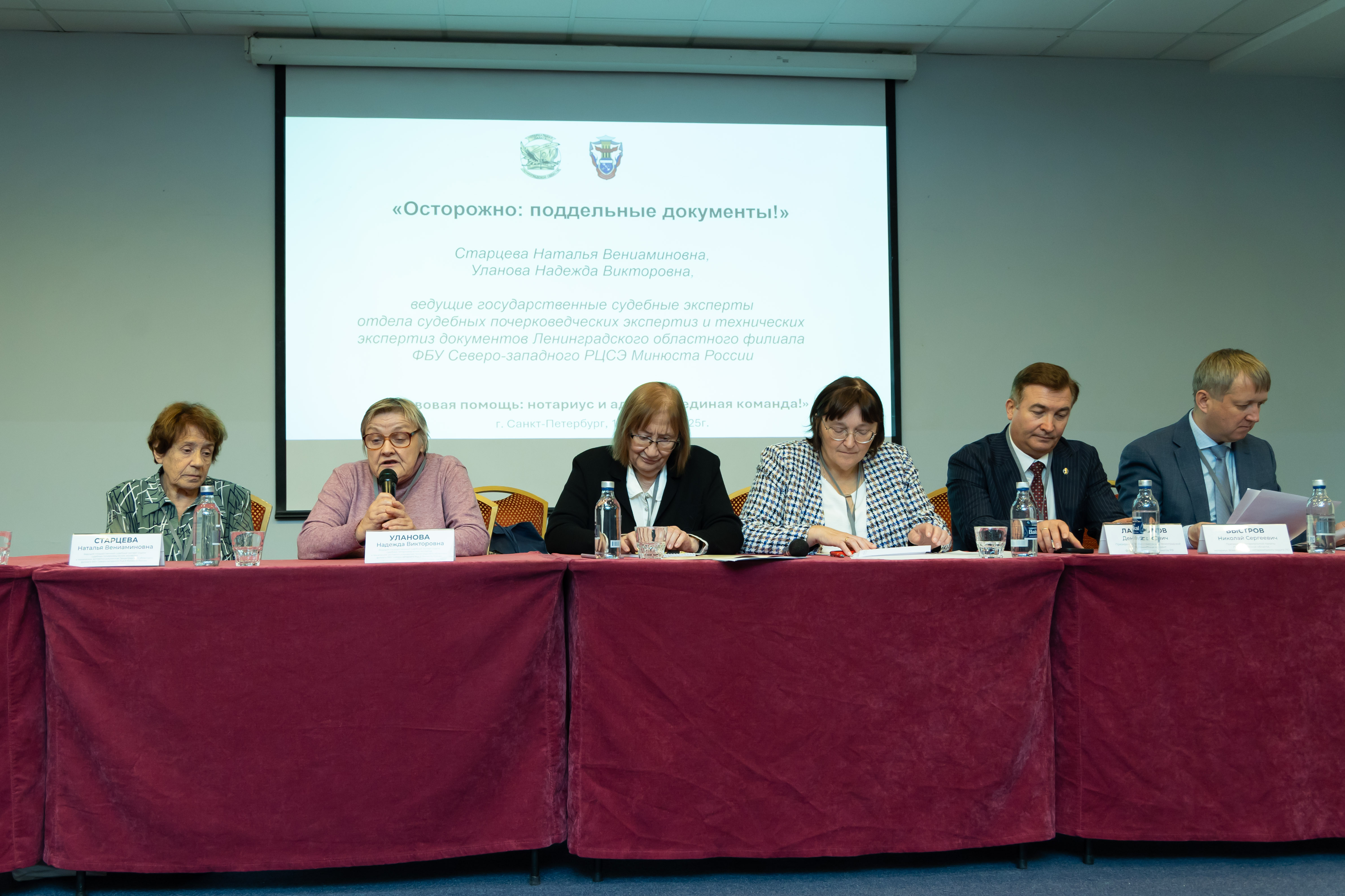 Также участники осветили вопросы противодействия мошенничеству и обеспечения доказательств. Специалисты Ленинградского областного филиала ФБУ Северо-западного РЦСЭ Минюста России Наталья Старцева и Надежда Уланова рассказали о методах выявления поддельных документов.