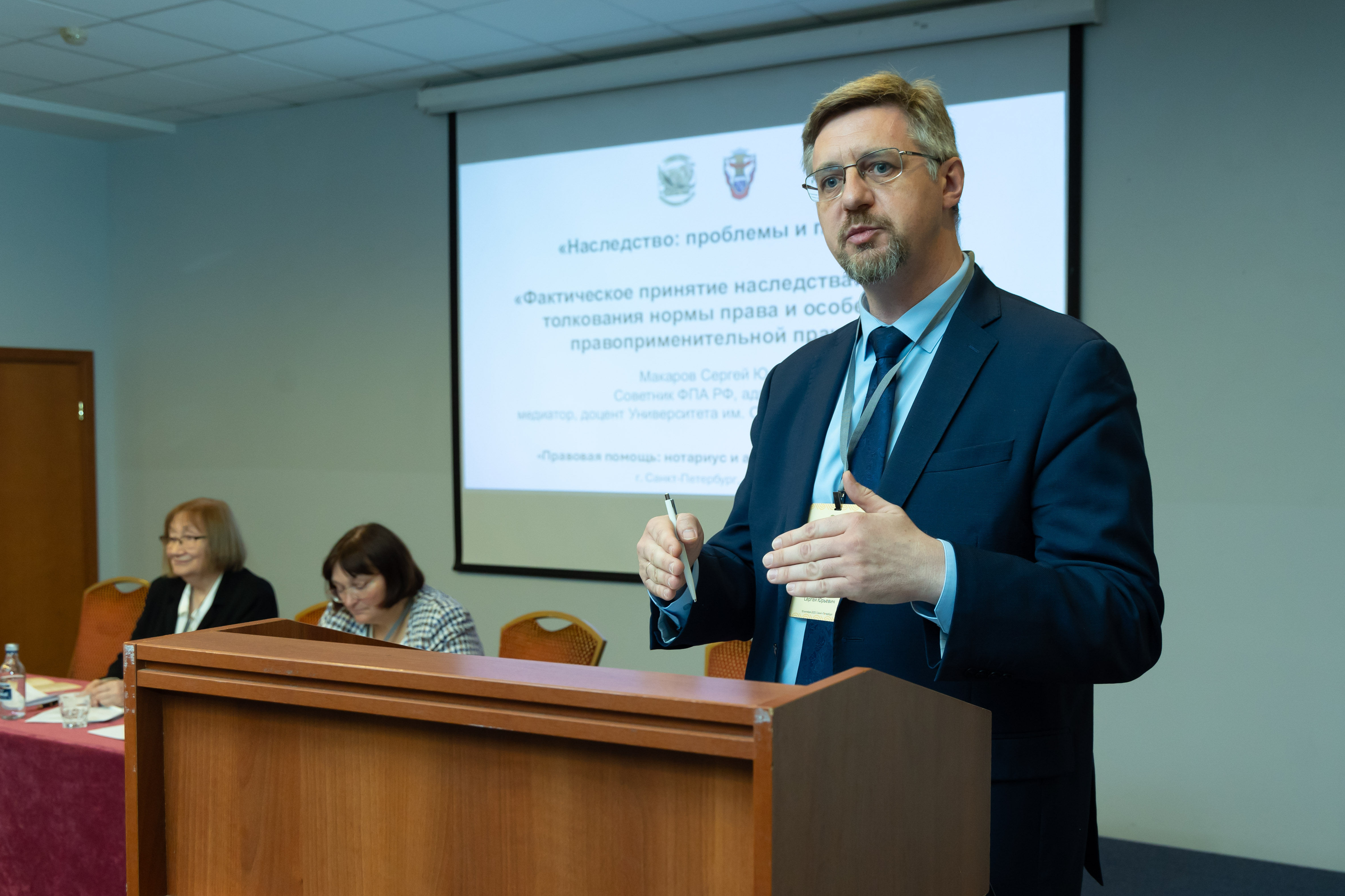 Одна из самых объемных сессий была посвящена актуальным проблемам наследственного права. Так, советник Федеральной палаты адвокатов РФ, медиатор, доцент Университета им. О. Е. Кутафина Сергей Макаров подробно разобрал проблемные аспекты фактического принятия наследства.